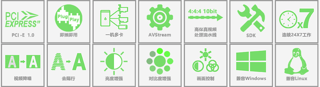 | 采用PCI-E總線接口,支持一機多卡,互不影響 標準PAL、NTSC制式彩色/黑白視頻輸入