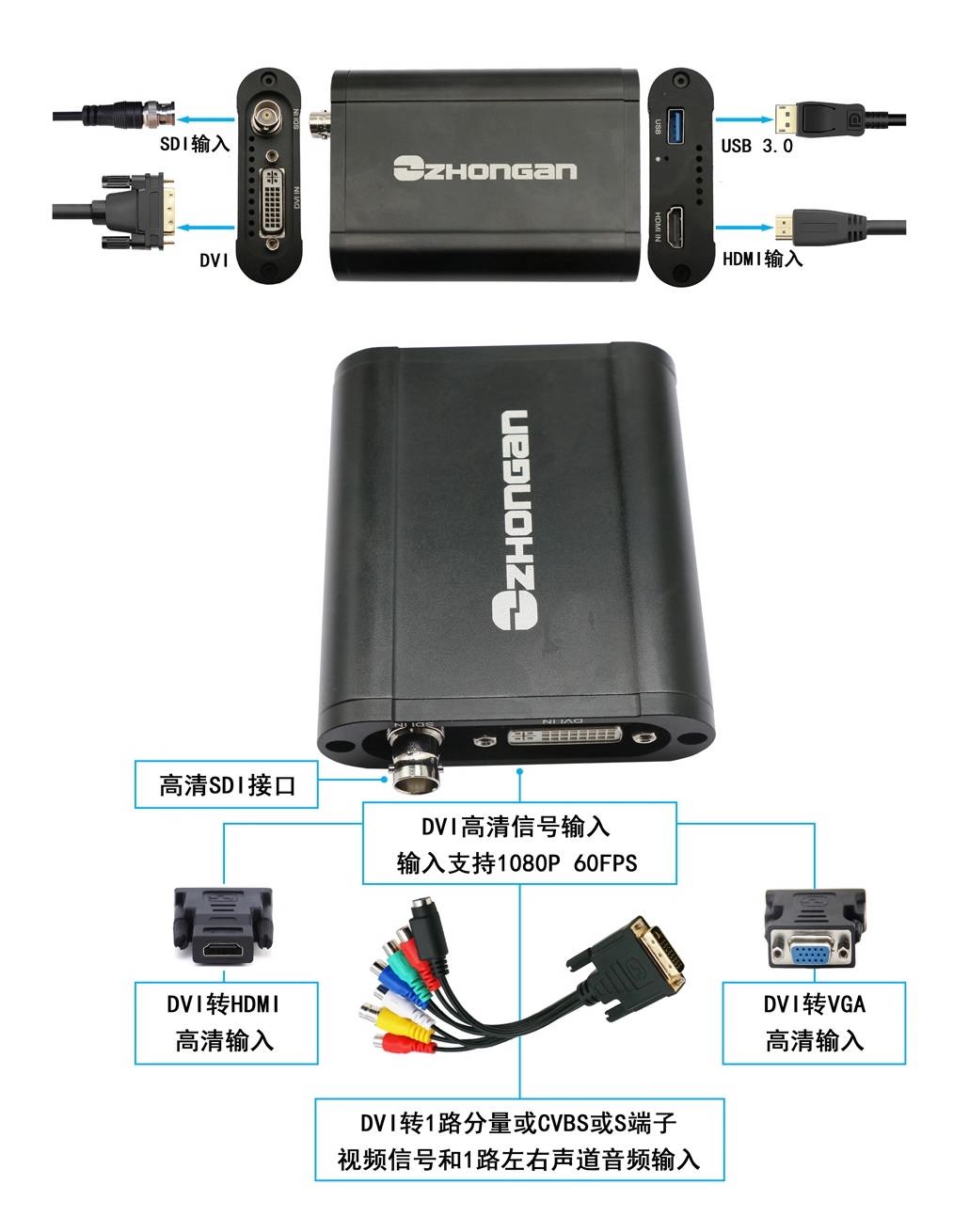 輸入接口 | 1個HDMI接口 1個DVI接口(可轉接VGA/CVBS/SVIDEO/YPBPR) 1個SDI輸入接口 模擬音頻立體聲輸入接口 |